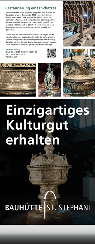 Um diese Aufgaben zu stemmen, sammelt die Bauhütte St. Stephani e.V. Spenden, um die Kirchengemeinde Georg Calixt zu unterstützen, das Taufbecken in seiner ganzen Schönheit und Sicherheit zu erhalten.