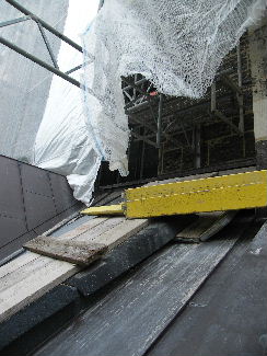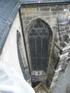 Damit bestand akuter Handlungsbedarf. Da dieses Fenster wegen des Heizungsanbaus auf der Außenseite auch schlecht zu erreichen war, wurde die Fassadenrenovierung 2008 genutzt, bei der das Gerüst von außen sowieso stand, um die Restaurierung durchzuführen.