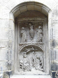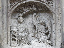 Wer am Westwerk unserer Kirche vorbeigeht, übersieht es oft: dieses gotische Kalkstein-Relief zeigt, wie der Engel Maria die Geburt von Jesus ankündigt. Maria selbst sitzt am Tisch und liest in der Heiligen Schrift. Über der Verkündigung ist Gott Vater inmitten der Wolke des Heiligen Geistes zu sehen. Das Kind strebt aus der Wolke auf Maria zu. Darüber die Kreuzigung mit Maria und Johannes unter dem Kreuz.