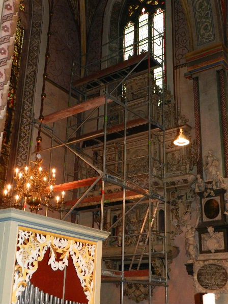 Wenn man auch das Lichtfenster nördlich des Lutherfensters restaurieren und säubern will, muss man am 5-stöckigen Epitaph von Mynsinger vorbei.
